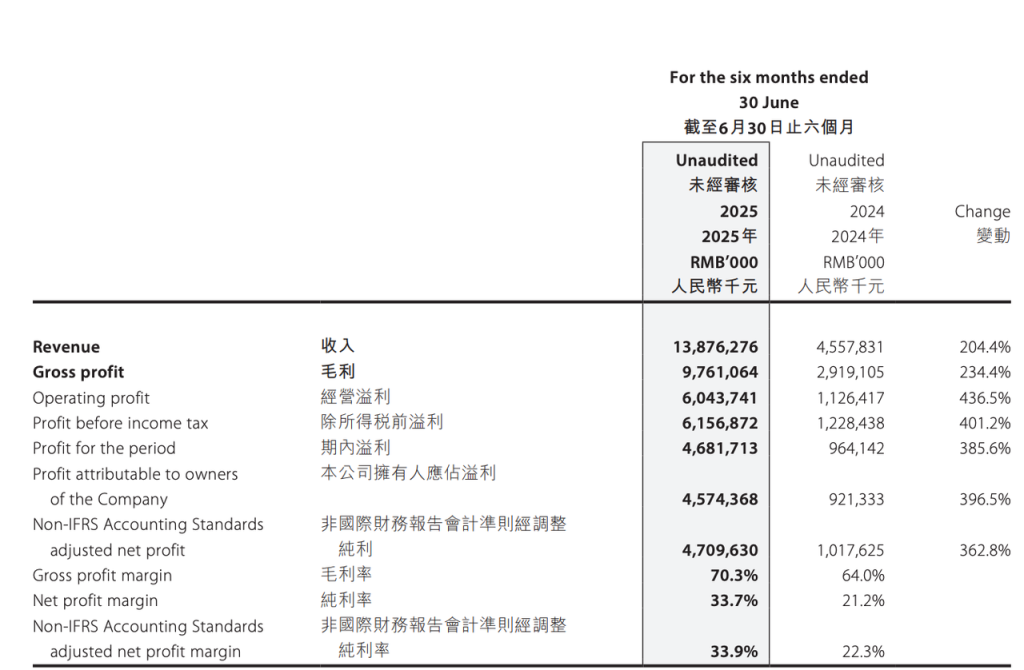 2025年,增长势头进一步加速:上半年营收达138.8亿元,同比增长204.4%,已超越2024全年;经调整净利润47.1亿元,同比增长362.8%。三季度未经审核数据显示营收同比增长245-250%,高增长态势延续。我们预计2025年营收可达360亿元左右(较2024年增长约176%),经调整净利率约维持在35%。