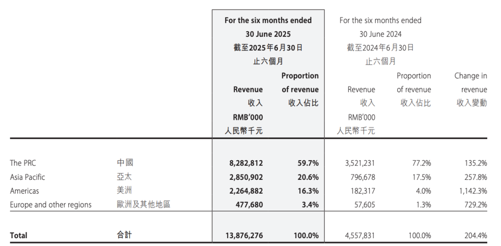 中国大陆营收82.8亿元,同比增长135.2%;亚太(除大陆)营收28.5亿元,同比+257.8%;美洲营收22.6亿元,同比爆增1142.3%;欧洲及其他地区4.8亿元,同比+729.2%。海外四大区域全线实现三位数以上增长,其中美洲(主要为美国市场)增速超过10倍,贡献约16%收入,成为扩张重点。