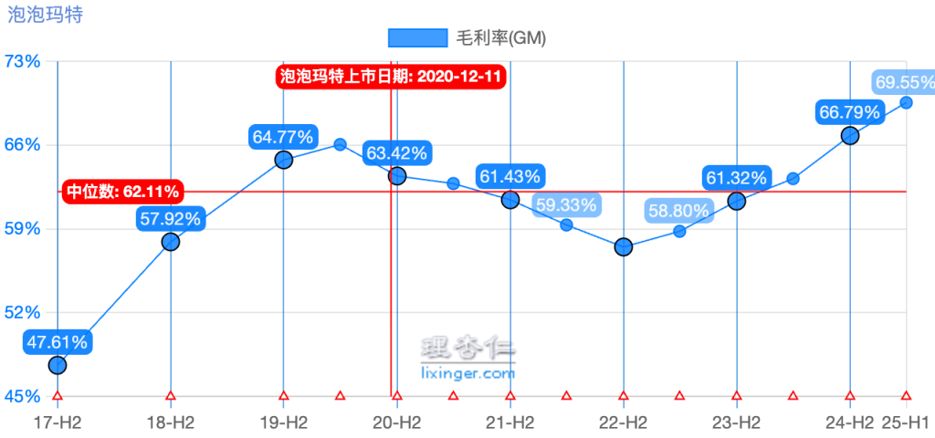 毛利率方面,得益于自有IP产品占比提升(版权费率降低)以及规模经济摊薄成本,最近三年毛利率连创新高:由2022年的57.5%升至2023年的61.3%,2024年进一步升至66.8%;2025年上半年毛利率达到70.3%,较上年同期又提高6.3个百分点。对比同行,公司的毛利率水平远高于传统玩具厂商(约40%左右)和多数零售企业,甚至接近一些奢侈品和动漫IP公司的毛利率,体现其IP附加值带来的高溢价能力。