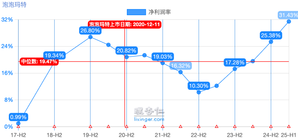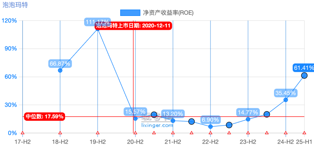 在上述因素共同驱动之下,泡泡玛特的ROE最近3年迅速提升,到25年上半年,ROE已经达到61%。