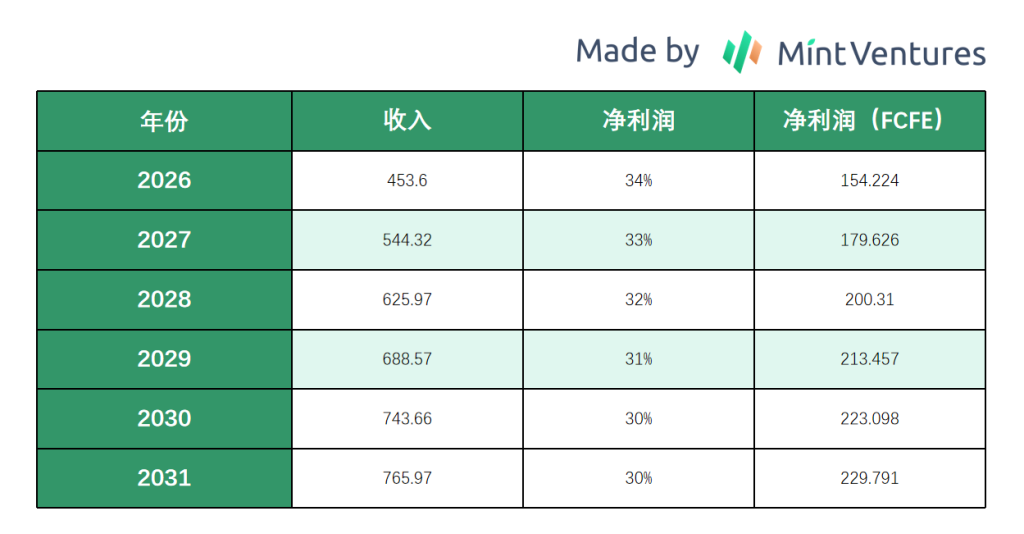- 资本开支:长期为收入的4%,营运资本变动忽略为0(简化计算,使自由现金流≈净利润)。