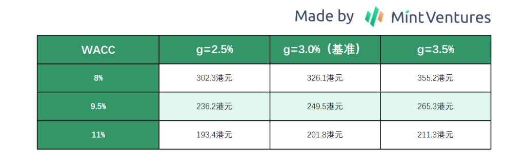 永续增长率(g)和WACC的变动对估值影响显著。以下是不同假设下的每股价值(港币):